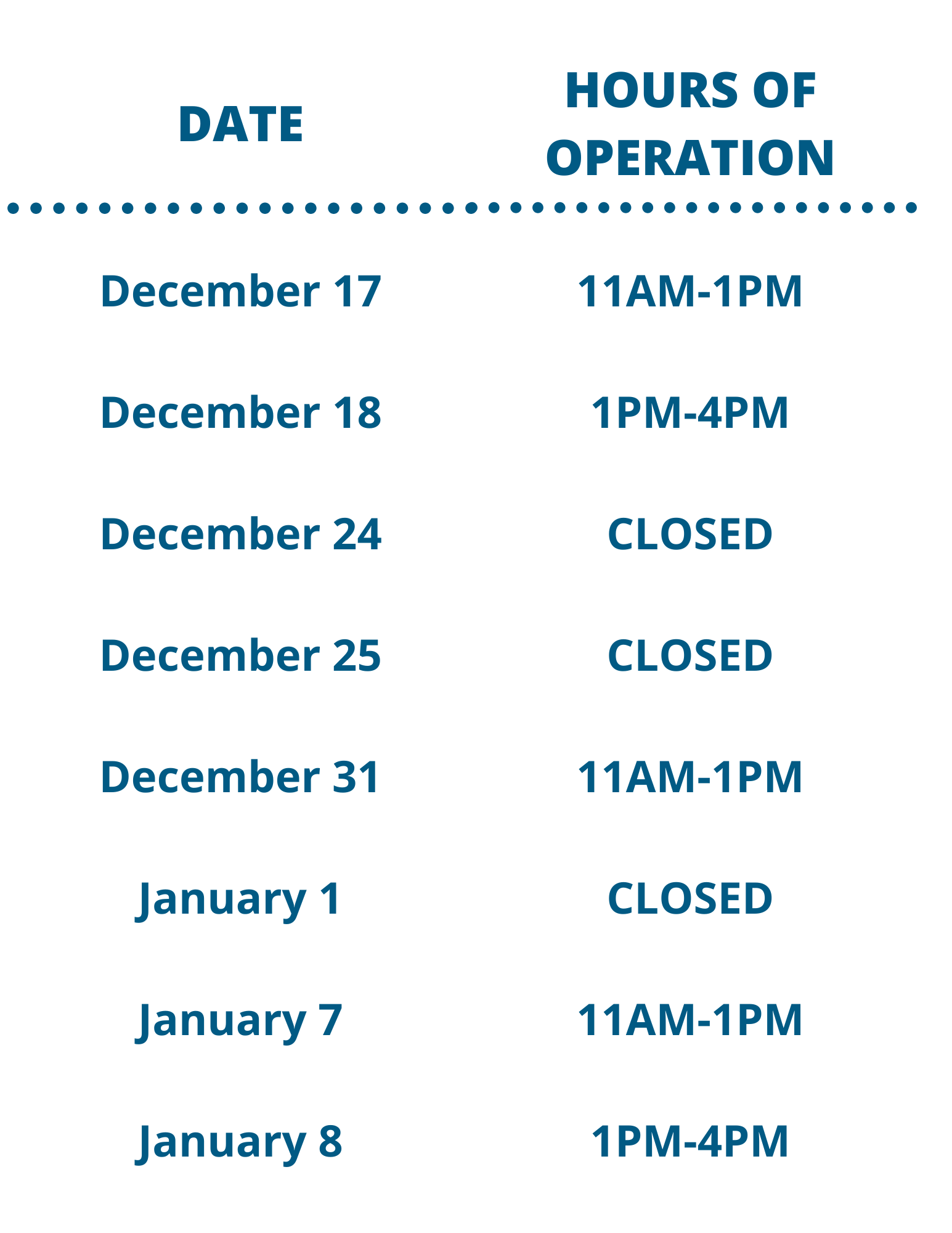 We are currently open on Wednesdays from 11 am to 1 pm and Thursdays from 1 pm to 4 pm. Please check your student email, or follow us on Instagram to stay up to date.