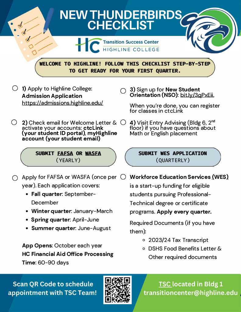 Getting started at Highline College requires a couple of steps, and TSC is here to assist you with planning your start date, exploring funding options and degree pathways, and navigating our diverse campus. See below for resources and tips for your journey.