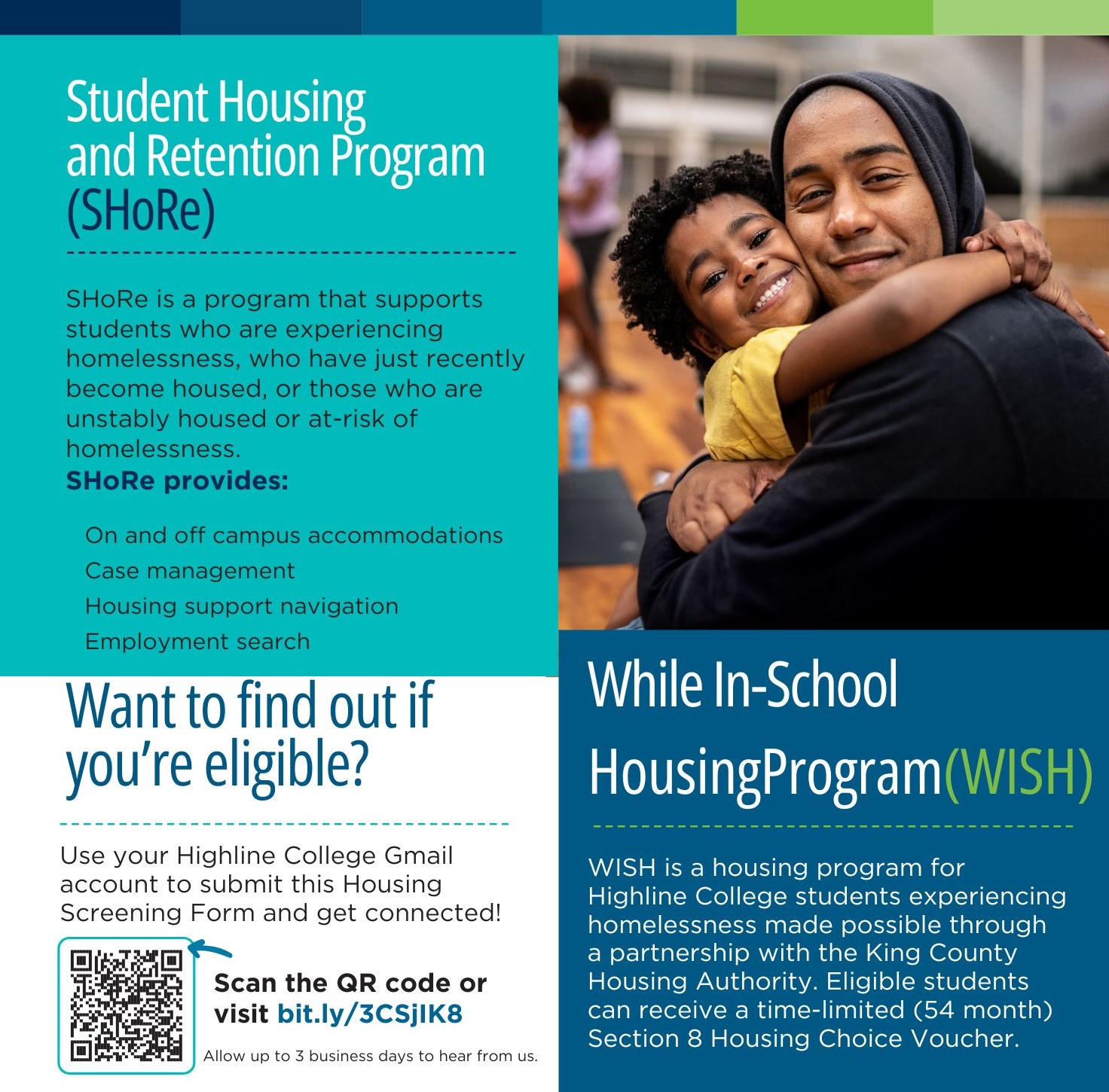 WISH is a housing program for Highline College students experiencing homelessness, offered through a partnership with the King County Housing Authority and supported by United Way of King County and the Highline College Foundation. Eligible students receive a time-limited Housing Choice Voucher (up to 54 months) that can be used at any Section 8–approved housing within KCHA’s service area. After graduation, vouchers remain active for an additional six months to support transition planning.